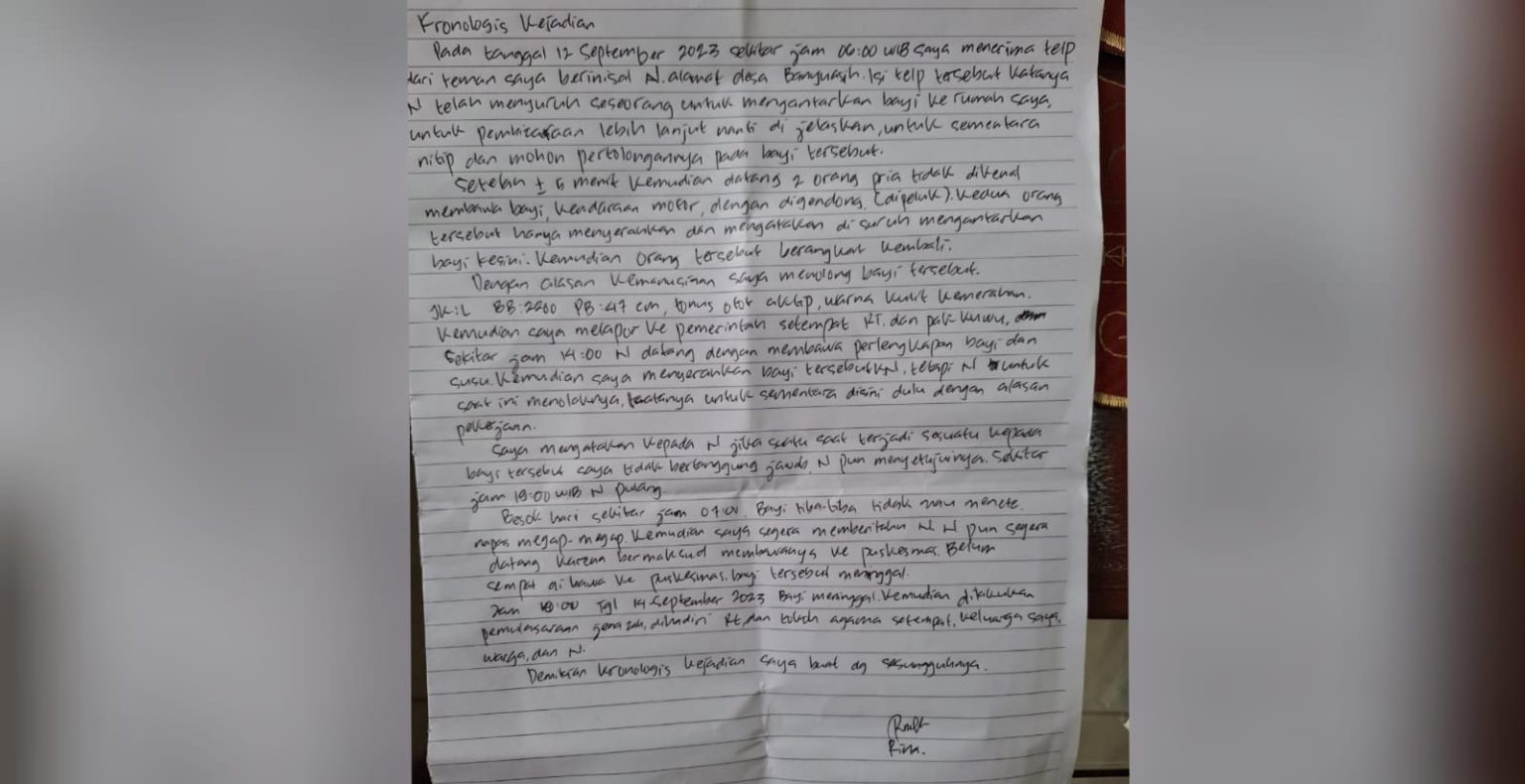 Bidan RN mengatakan bahwa pada tanggal 12 September 2023 sekitar jam 05.30 Wib, dirinya di tlpn seorang berinisial Nn yang merupakan sahabatnya dari Desa Banyuasih, Kecamatan Taraju. Dalam percakapan via seluler Nn memita tolong bahwa dirinya ingin menitipkan bayi kepadanya.