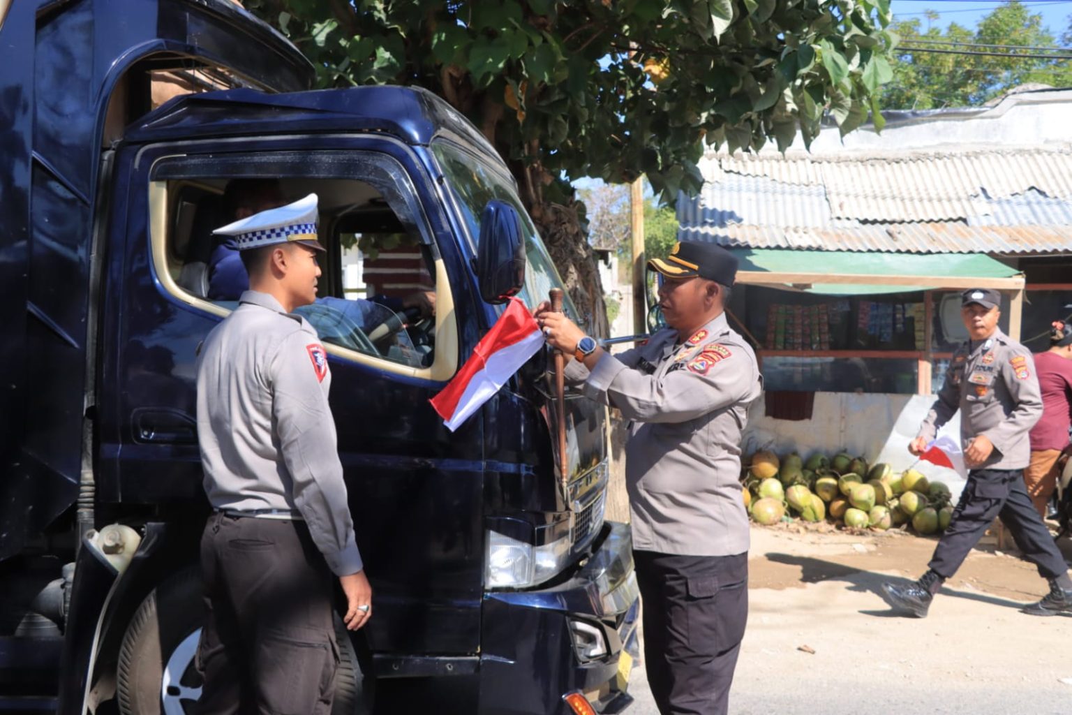 Pembagian bendera dilaksanakan di sejumlah titik strategis di wilayah hukum Polres Sumbawa Barat, dengan menyasar warga, pengendara, pedagang kaki lima, hingga pelajar.