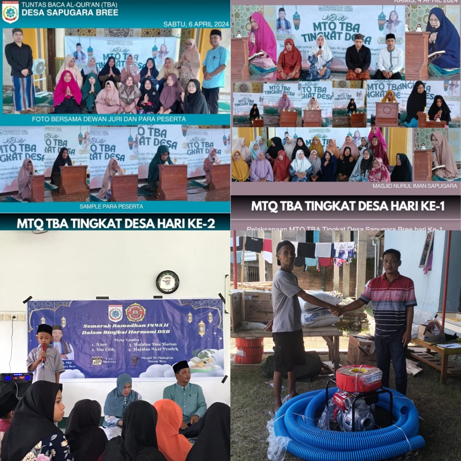 Di Penghujung bulan suci Ramadhan 1445 H/2024 M, sudah banyak kegiatan yang dilaksanakan oleh Pemerintah Desa Sapugara Bree, selain membagikan insentif pengurus masjid dan guru ngaji, juga sudah di salurkan BLT – DD Tahap II Tahun Anggaran 2024, selanjutnya pada hari kamis 4 April 2024 dan hari Sabtu 6 April 2024 bertempat di Masjid Nurul Iman Sapugara, Kecamatan Brang Rea Kabupaten Sumbawa Barat. Pemerintah Desa Sapugara Bree bekerjasama dengan pengurus TP.PKK dan pengurus TBA Desa juga mengadakan kegiatan MTQ TBA tingkat desa yang pesertanya ibu – ibu TBA desa Sapugara Bree dan cabang lombanya adalah Tartil dan Tahfiz.