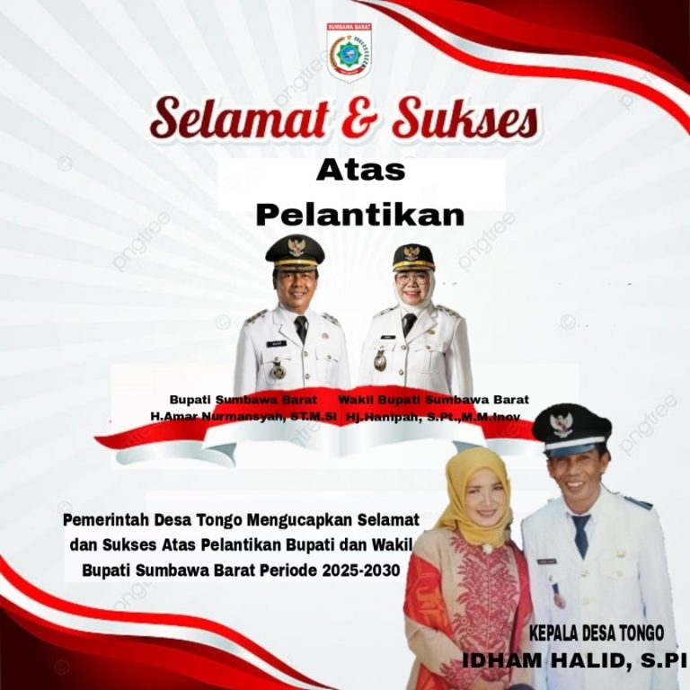 Share WhatsApp Facebook Twitter Email Sumbawa Barat Obormerahnews.com-Pemerintah Desa Tongo bersama Staf mengucapkan Selamat dan Sukses atas Pelantikan H.Amar Nurmansyah,ST,.M.Si dan Hj.Hanipah ,S.Pt MM.inov sebagai Bupati dan Wakil Bupati Sumbawa Barat periode 2025-2030. Bupati dan Wakil Bupati Sumbawa Barat Pelantikan Pemdes Tongo