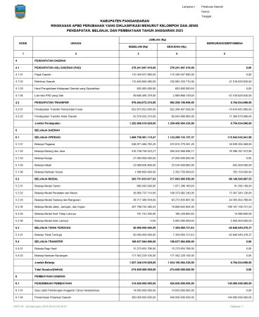Berikut Ringkasan APBD Perubahan yang Diklasifikasi Menurut Kelompok dan Jenis Pendapatan, Belanja, dan Pembiayaan Tahun Anggaran 2025: