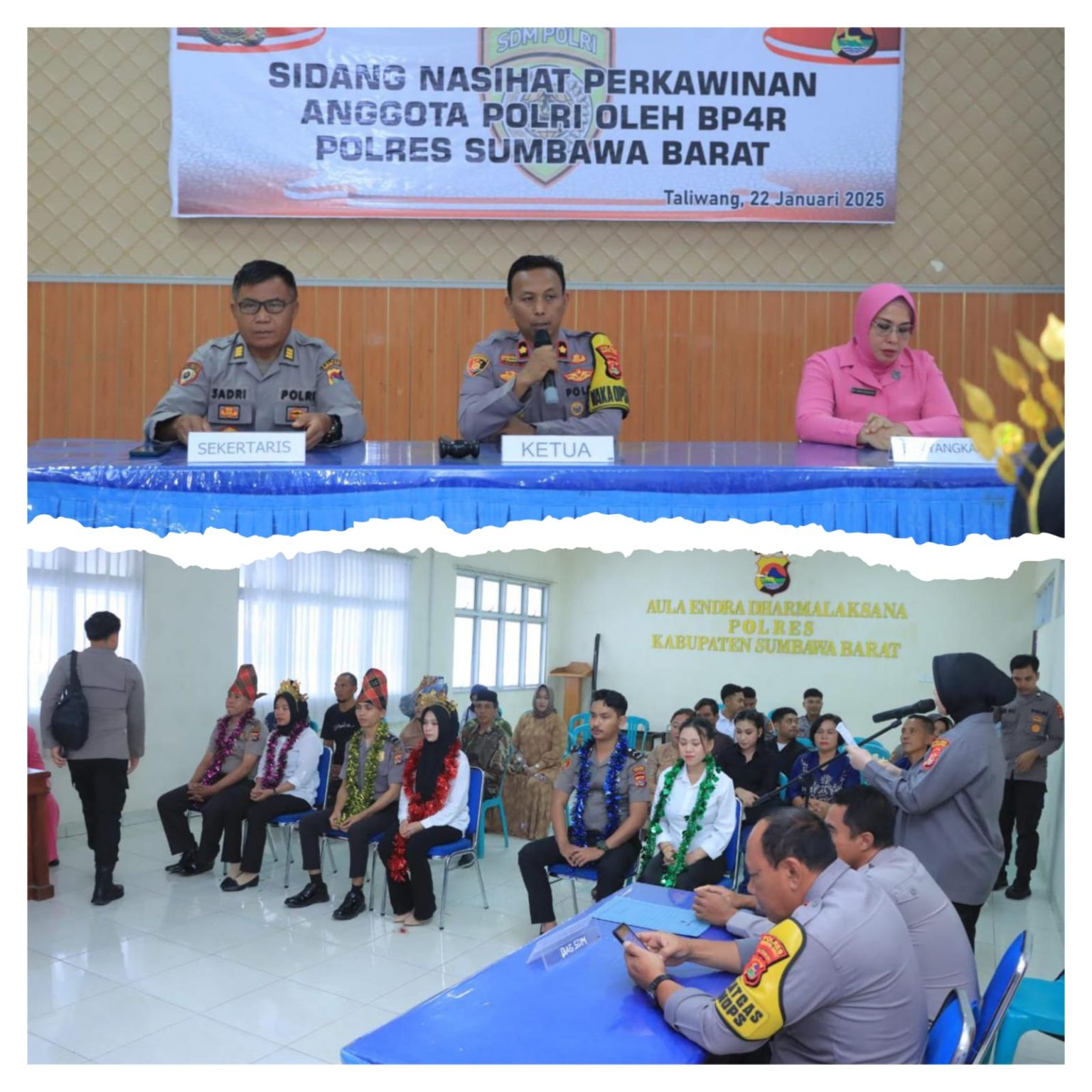 Sumbawa Barat Obormerahnews.com-Badan Pembantu Penasehat Perkawinan Perceraian dan Rujuk (BP4R) Polres Sumbawa Barat menggelar sidang pra nikah , bagi anggota Polri dan calon pasangannya yang akan melangsungkan pernikahan,, sidang berlangsung di Aula Endra Dharma Laksana Polres Sumbawa Barat Rabu, 22 Januari 2025.