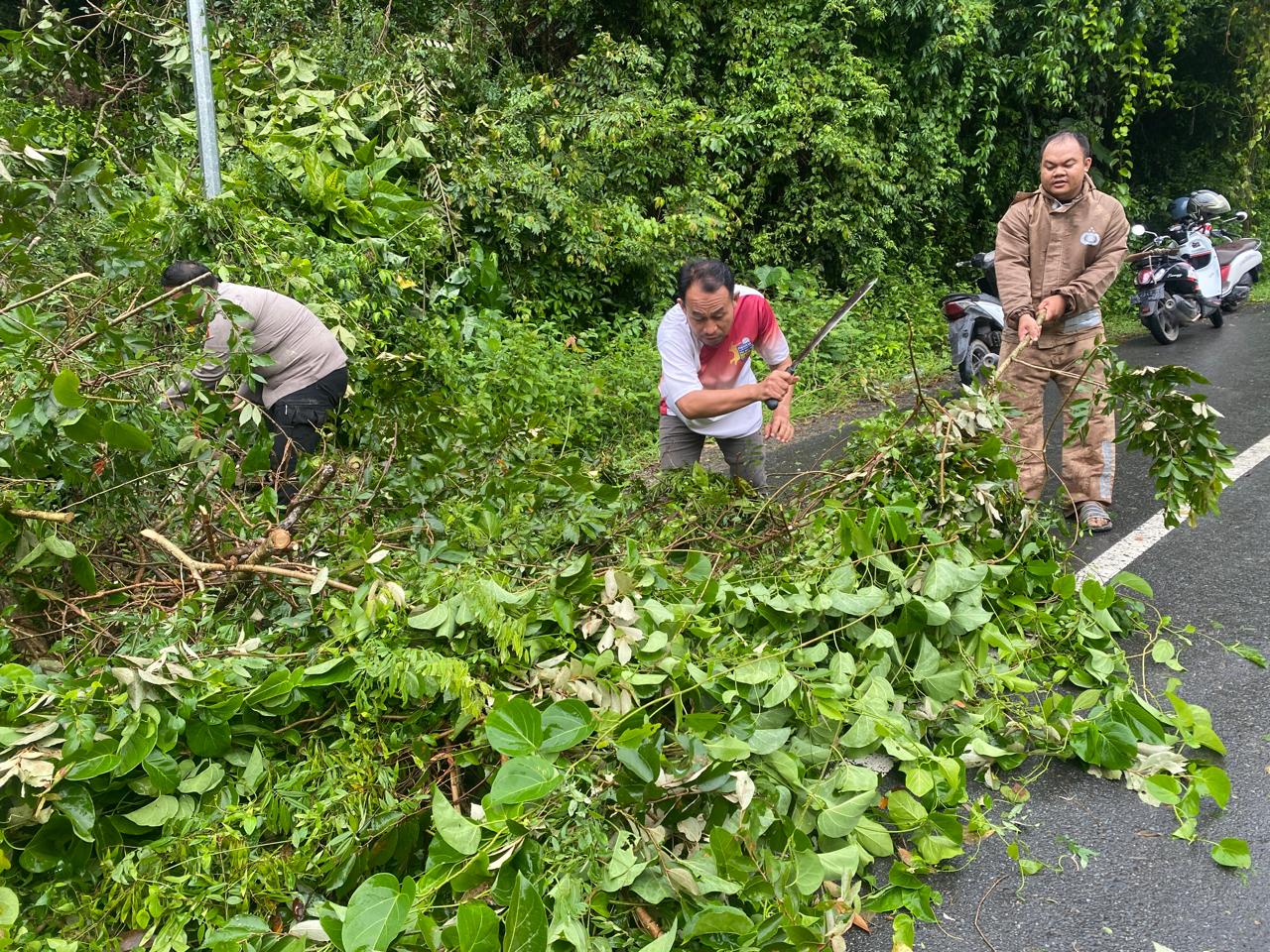 Dengan semangat gotong royong, Bhabinkamtibmas bersama Plt. Camat Sekongkang, aparat pemerintah desa, serta masyarakat dan pengguna jalan membersihkan ranting dan batang pohon menggunakan alat seadanya. Langkah cepat ini dilakukan agar akses jalan dapat segera kembali dilalui dan aktivitas masyarakat tidak terganggu lebih lama.
