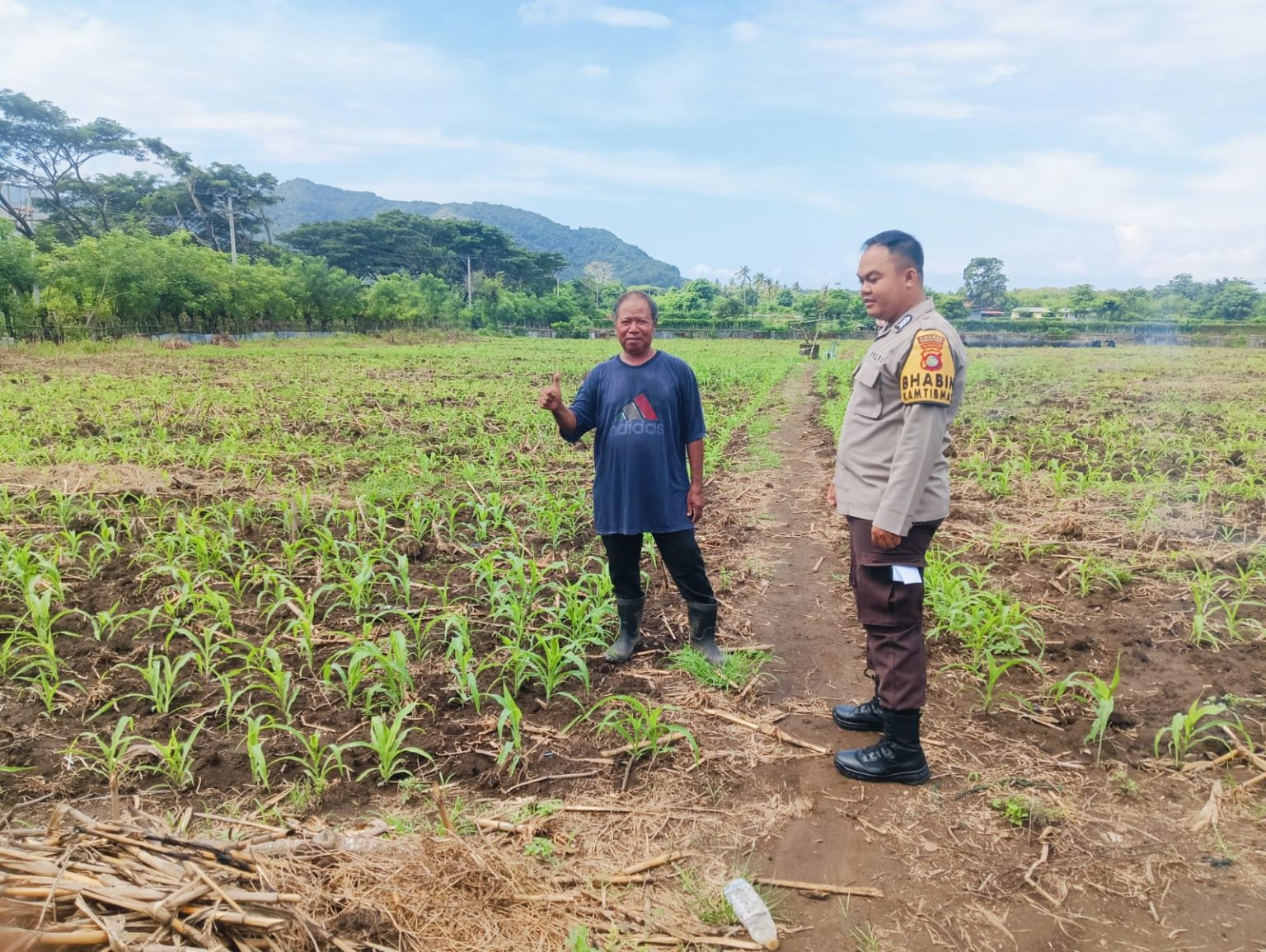 Kehadiran Bhabinkamtibmas di lahan jagung milik warga dengan umur sekitar 15 hari setelah tanam perkembangan tanaman tampak sehat dan pertumbuhan yang memuaskan, ia menghimbau kepada petani jika pada tahap pemupukan mengalami kendala kelangkaan pupuk agar segera menyampaikan kepada dirinya untuk dikoordinasikan kepada PPL Pertanian.
